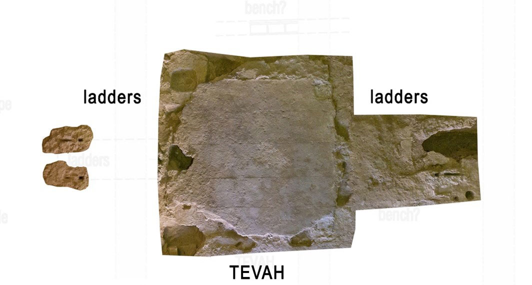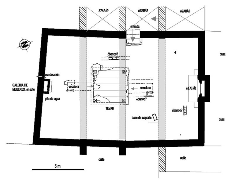 En este sector se localizaron ta  mbién restos del pavimento original de yeso compacto y las bases de la tarima donde se situaba la bimá o tevá, el estrado donde se leía la Torá.