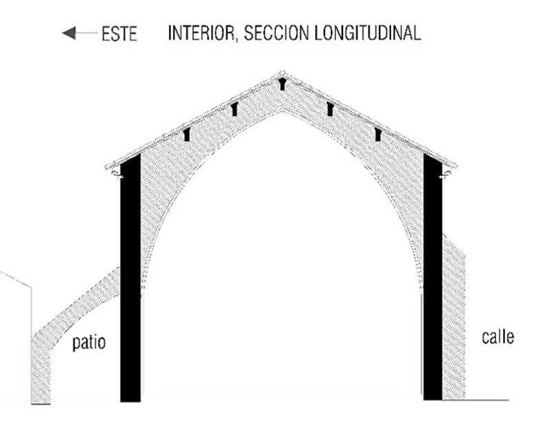 Sección longitudinal de la antigua sinagoga de Híjar, que muestra la estructura interior original del edificio: un gran arco diafragma apuntado sosteniendo la techumbre de madera, con el acceso al patio a la izquierda y la fachada hacia la calle a la derecha. Esta configuración arquitectónica es característica de las sinagogas medievales conservadas en la Corona de Aragón. ©Antonio Hernández Pardos 2025.