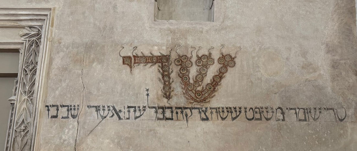 En la zona central del testero se conservan los restos del enmarque gótico tardío del Hejal cristianizado —que interrumpe físicamente la continuidad del versículo hebreo— y, junto a él, a su izquierda, parte de las pinturas judías originales. Entre ellas, destaca la representación de una menorá, cuyas formas y gama cromática coinciden con la decoración del “Ashré” del lado derecho, confirmando que ambos elementos pertenecían a un mismo programa iconográfico sinagogal del siglo XV.