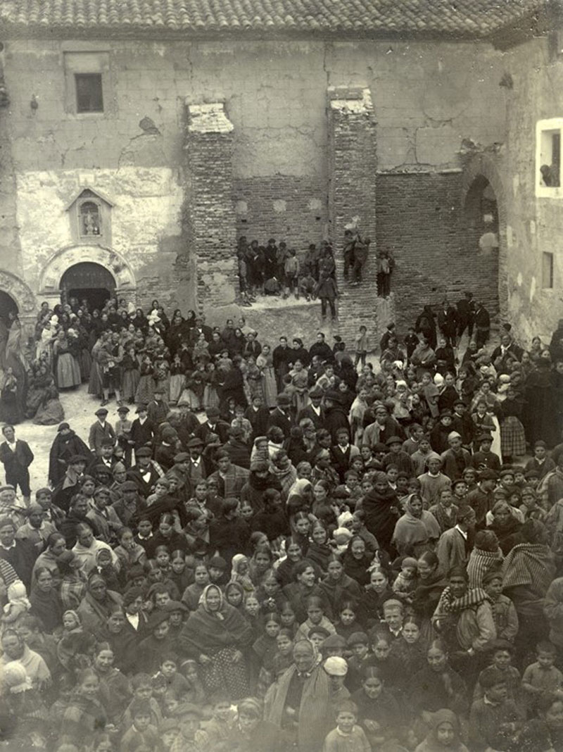 Al fondo se distingue la antigua ermita de San Antonio Abad —levantada sobre la que fue la sinagoga medieval de Híjar— antes de sus reformas del siglo XX. Imagen realizada por José Antonio Dosset entre 1880 y 1910 (Archivo Dosset, Instituto de Estudios Turolenses).